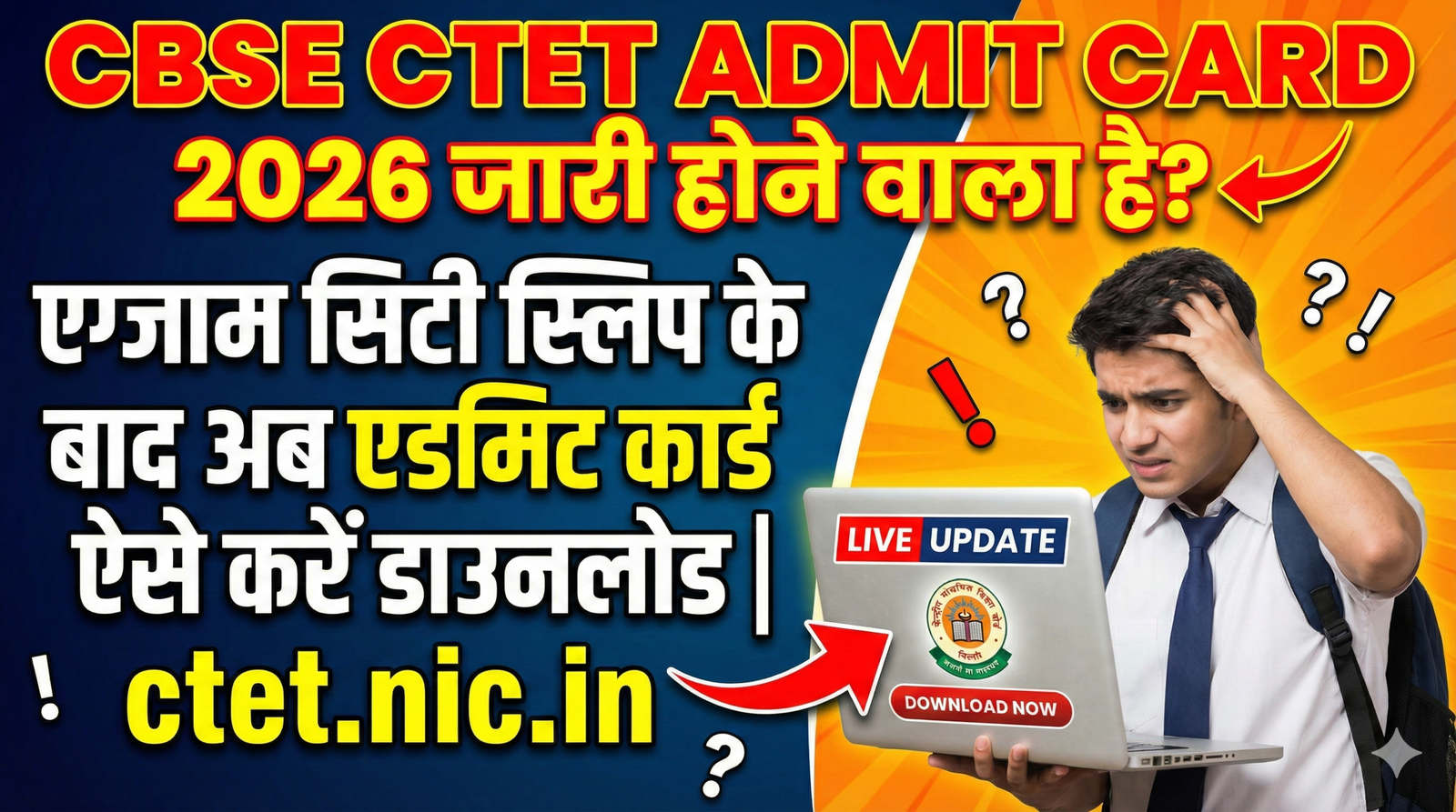 CBSE CTET Admit Card 2026 को लेकर अभ्यर्थियों के बीच उत्सुकता लगातार बढ़ती जा रही है। सीटेट एग्जाम सिटी स्लिप जारी होने के बाद अब उम्मीदवारों की नजर सिर्फ एक ही चीज पर टिकी है और वह है CTET का एडमिट कार्ड। केंद्रीय माध्यमिक शिक्षा बोर्ड द्वारा जल्द ही आधिकारिक वेबसाइट ctet.nic.in पर एडमिट कार्ड जारी किया जा सकता है। जिन उम्मीदवारों ने CTET 2026 के लिए आवेदन किया है, उनके लिए यह सबसे जरूरी दस्तावेज होता है, जिसके बिना परीक्षा केंद्र में प्रवेश नहीं मिलता।
